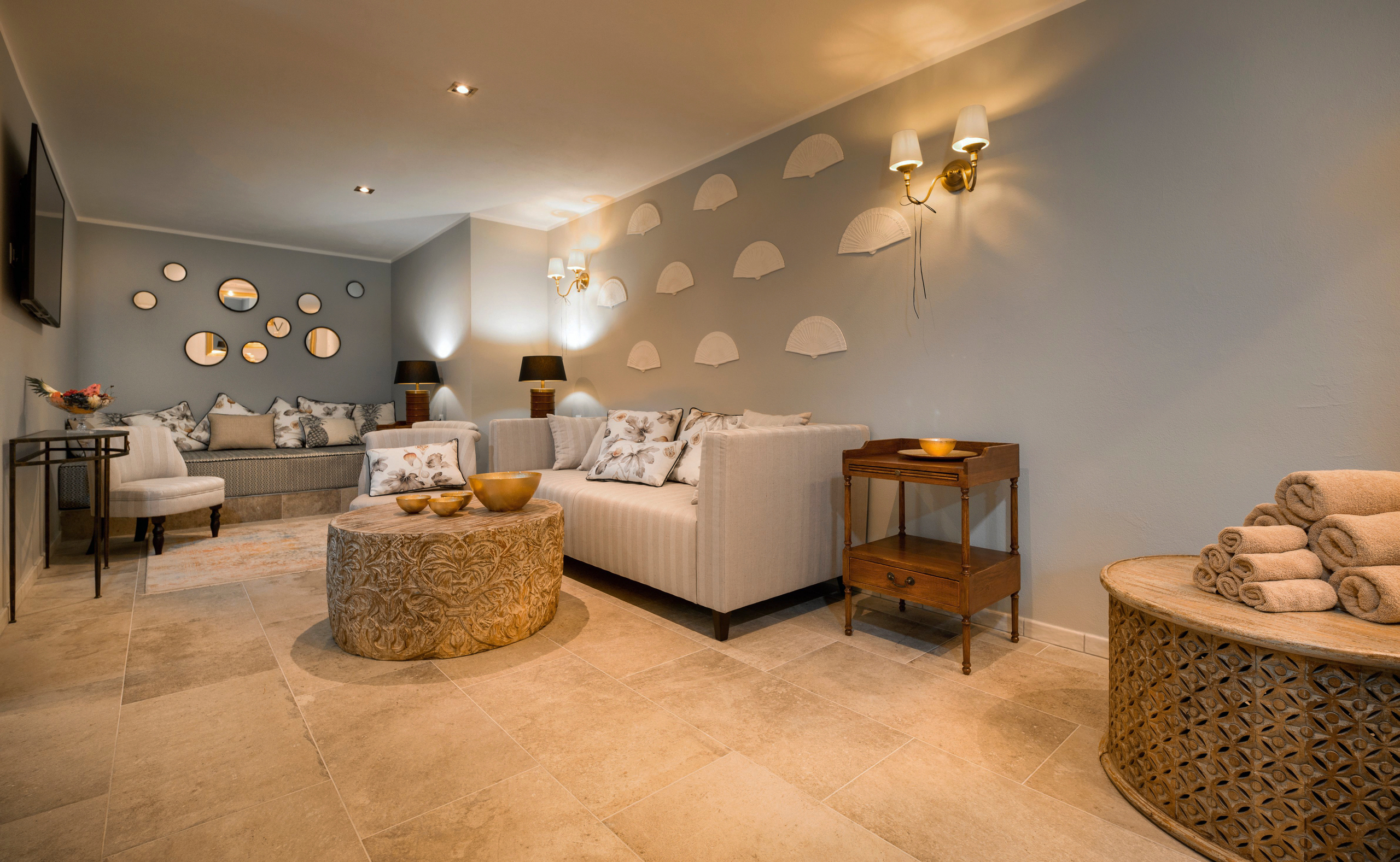 ✓ Round tables with white tablecloths